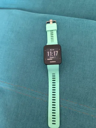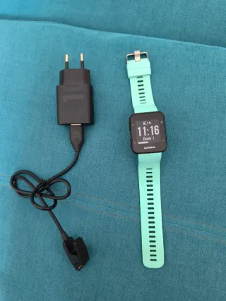 Reloj deportivo Garmin con correa de silicona. - Color de la correa: turquesa. -Color de la caja: negro - Hebilla metálica. El cargador tiene un trozo roto como se ve en la foto, pero no afecta a la hora de cargarlo