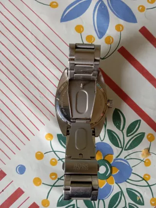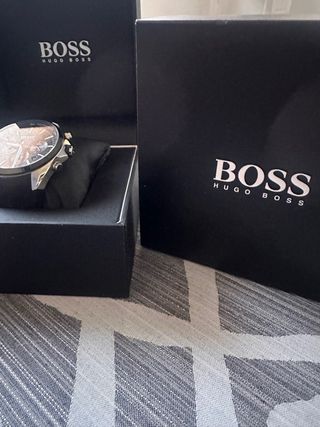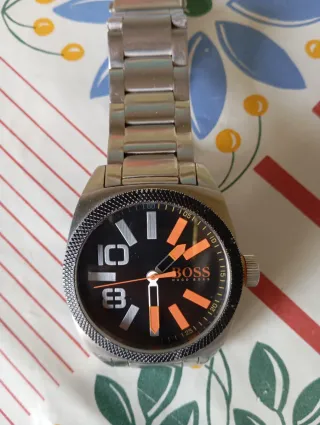 Elegante reloj de pulsera de la marca BOSS Hugo Boss. - Esfera negra con detalles naranjas. - Correa de eslabones plateada. En buen estado