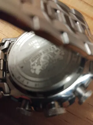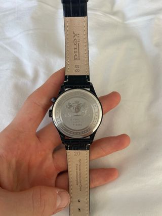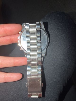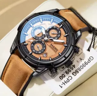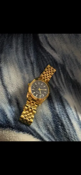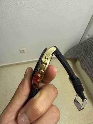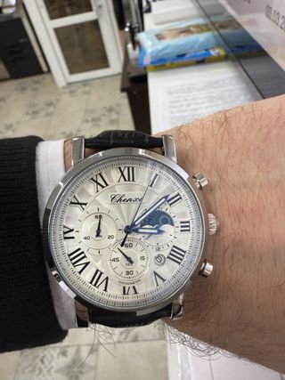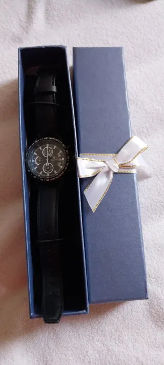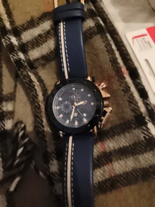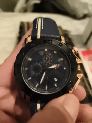 Reloj de pulsera para hombre con correa de piel y diseño multifunción. Funcionan todas las esferas aún así tiene su cronómetro y las tres esferas funcionales calendario etc - Correa de piel azul con detalles blancos. - Bisel negro y detalles dorados en la esfera. - Resistente al agua (WR). - Cierre de hebilla. Fue un regalo y como soy una persona bastante delgada me queda bastante grande así que solo lo usé el día que me lo regalaron