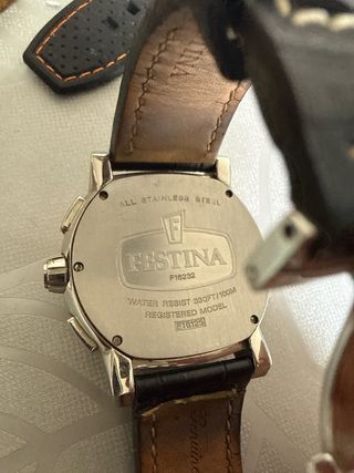 Reloj Festina con correa de cuero negra y detalles plateados. - Esfera negra. - Cronógrafo. - Correa de cuero. - Bisel plateado. Correa para cambiarla