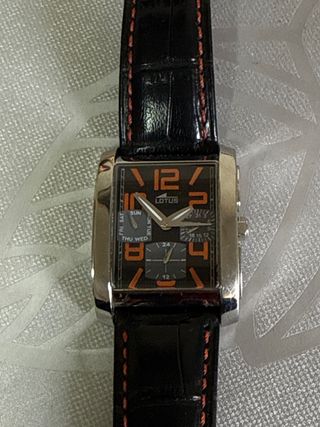 Elegante reloj Lotus con correa negra y detalles plateados. Un accesorio moderno y versátil. - Correa de piel negra. - Caja de acero inoxidable plateada. - Esfera con detalles naranjas.
