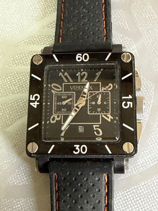 Reloj de pulsera con diseño cuadrado y correa. - Esfera negra con detalles plateados. - Correa de cuero negra con costuras naranjas. - Bisel con marcadores de tiempo.