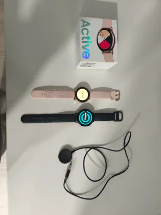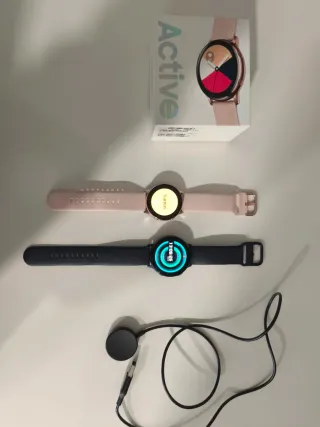 Pack de dos relojes Samsung, uno en color negro y otro en rosa. Incluye cargador. - Reloj negro con correa deportiva. - Reloj rosa con correa a juego. - Cargador inalámbrico.