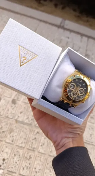 Elegante reloj de la marca Guess con un diseño sofisticado. - Esfera en tono negro. - Detalles en color dorado. - Correa de cuero negra Acepto cambios Entrega en mano en Cartagena Tiene sus etiquetas y su caja