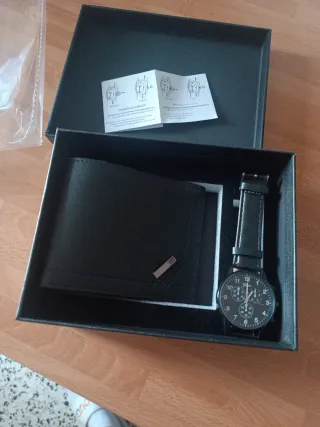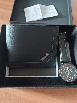 Elegante conjunto de cartera y reloj para hombre. Ideal como regalo para un hombre, regalo por San Valentín o como regalo por el día del padre - Cartera de piel. - Reloj con correa de piel. Se entrega en su caja donde caben ambas cosas.