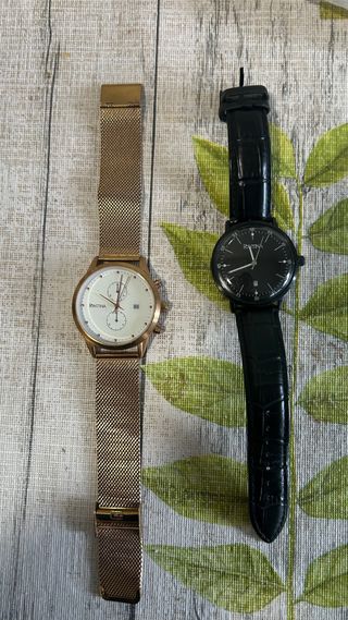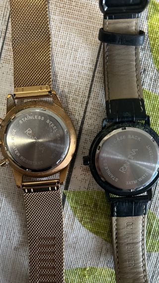 Dos relojes de la marca Pontina, uno con correa negra y otro con correa dorada. (Pendiente cambiar la pila de ambos) - Reloj con correa de malla dorada y esfera blanca. - Reloj con correa de piel negra y esfera negra.