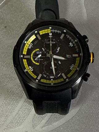 Reloj Citizen Eco-Drive con cronógrafo y correa negra. Un accesorio moderno y funcional. - Esfera negra con detalles en amarillo. - Indicador de fecha. - Resistente al agua (verificar especificaciones del modelo). - Tecnología Eco-Drive (carga con luz).