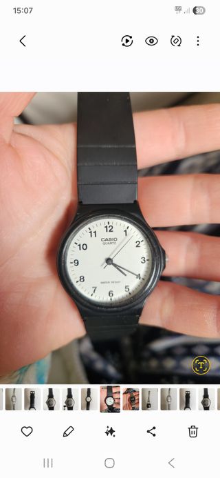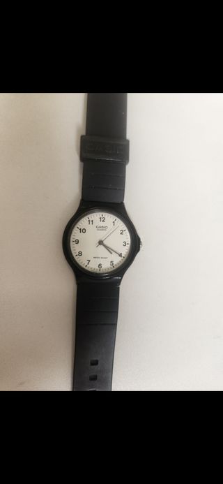 Reloj analógico Casio con correa negra y esfera blanca. Vintage - Correa de resina negra. - Esfera redonda blanca con números negros. - Resistente al agua. Lo unico le falta pila.