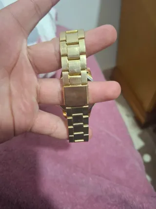 Elegante reloj para mujer con correa negra y detalles dorados. Funciona perfectamente y incluye pulseras. - Diseño rectangular. - Esfera con acabado degradado.