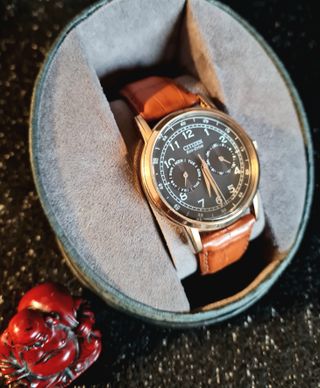 Citizen Eco‑Drive AO9003‑08E Elegante reloj en acero dorado rosa, esfera negra y correa de cuero marrón. Movimiento Eco‑Drive, cristal mineral, sub‑diales de fecha y día. Resistente al agua 30M.