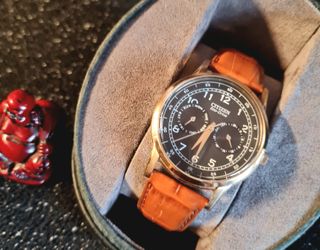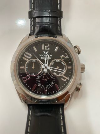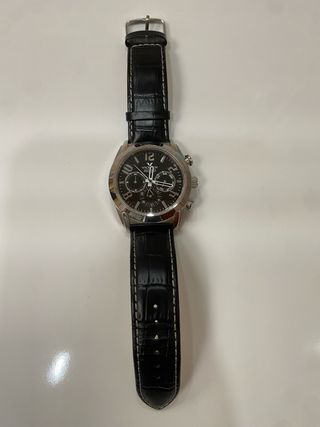 Elegante reloj con correa de piel negra y esfera detallada. - Diseño con múltiples subesferas. - Indicador de día y mes. - Función Sun-Moon. El reloj viene en su caja original y incluye pila, solo habría que quitar el plástico de la ruedecilla y presionarla y ya funcionaría