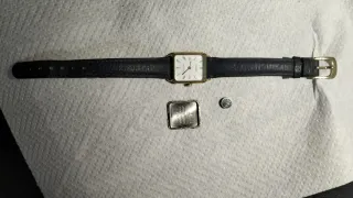 Elegante reloj de pulsera con correa. - Esfera redonda. - Correa de cuero negra. - Detalles dorados en la caja. Está mal estado no veo la marca