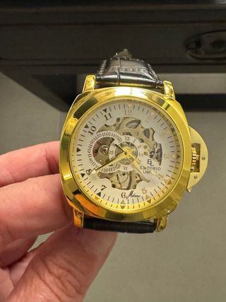 Reloj de pulsera con diseño esqueleto y detalles dorados. La correa es de cuero. - Esfera con movimiento visible. - Correa de cuero negra.