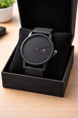 Elegante reloj con un diseño minimalista y moderno, presentado en su caja original. - Esfera completamente negra. - Correa de cuero negra. - Caja del reloj de color negro. - Detalles sutiles en la esfera.