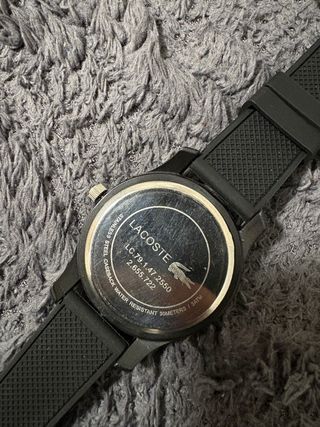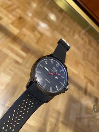 Elegante reloj Lacoste con correa de silicona. - Diseño moderno y minimalista. - Esfera negra con detalles blancos. - Hebilla plateada.