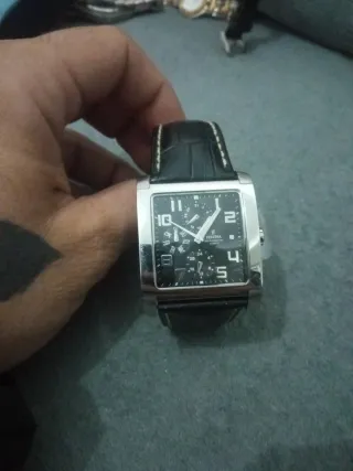 Elegante reloj Festina con correa de piel negra y detalles plateados. - Esfera negra con indicadores horarios y subesferas. - Correa de piel con pespuntes blancos. - Caja cuadrada de acero inoxidable.