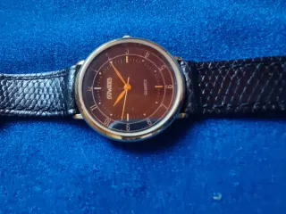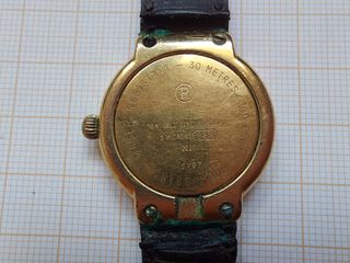 Reloj de pulsera Courreges vintage. En funcionamiento, con batería.Convendría revisión y limpieza interior. Caja dorada, fondo negro, numeración romana, calendario. 2,5 cm ancho de esfera Longitud total: 20 cm. En el reverso se lee: Water resistant – 30 metres / 100 feet – Swiss made 18K gold electroplated – S Microns PPS 2220 2793 - Estado: Micro rasguños en la parte delantera y trasera de la caja (ver imágenes). Correa de piel con cierre oxidado. -- Tarjeta de garantía original. Núm. serie 2793. Año 1990. -- Acepto ofertas. Descuentos por la compra de más de un artículo. ...
