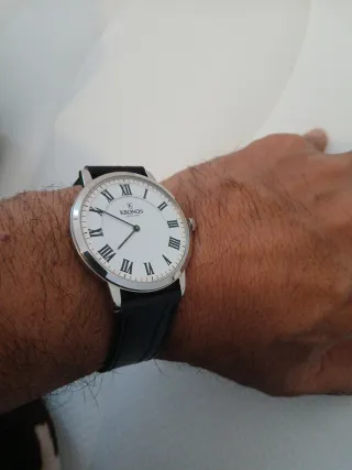 Elegante reloj KRONOS con correa de piel de cocodrilo Kronos Elegance Extraplano White, un modelo que destaca por su diseño clásico y perfil delgado. Detalles Técnicos Caja: Fabricada en acero inoxidable con un diámetro de 40 mm. Cristal: Incorpora cristal de ZAFIRO, conocido por su alta resistencia a los arañazos. Esfera: De color blanco puro, con elegantes números romanos plateados y el logotipo de Kronos "Since 1930". Correa: Piel negra con grabado de cocodrilo y hebilla de tipo ardillón. Perfecto estado muy bueno excelente funcionalidad Envío protegido Envío inmediato
