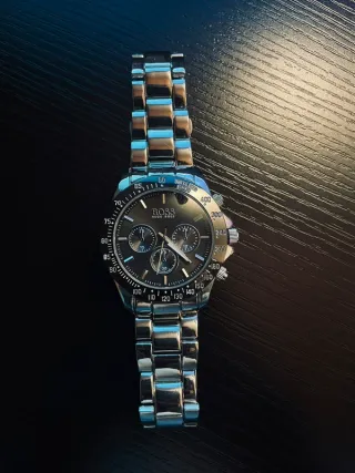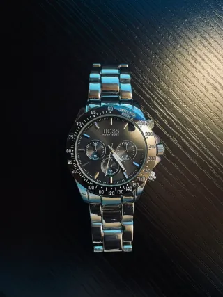 Elegante reloj Hugo Boss con diseño cronógrafo. Talla única. Totalmente ajustable. Envío por Correos - Esfera en tono oscuro. - Correa de eslabones plateados. - Bisel con escala taquimétrica.