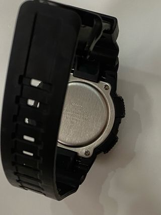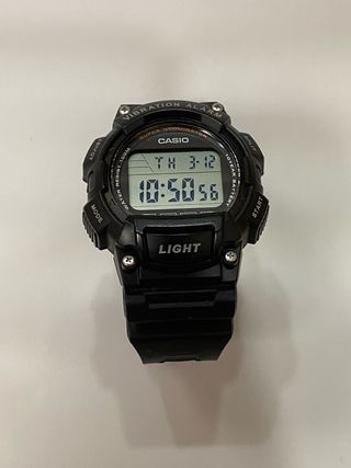 Reloj Casio con correa negra y funciones de vibración y alarma. Resistente al agua hasta 100 metros. - Super iluminador. - Batería de 10 años.