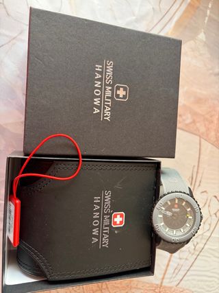 Elegante reloj de la marca Swiss Military Hanowa. - Caja y correa en tonos negro y gris. - Diseño moderno y funcional. No nuevo pero igual de nuevo he puesto dos veces Precio final ,lo siento