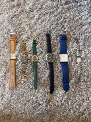 Conjunto de cinco relojes para mujer con diferentes diseños y correas. - Correa de eslabones plateados. - Correa de piel verde. - Correa de piel color coñac. - Correa de piel negra. - Correa de piel azul con textura de cocodrilo.