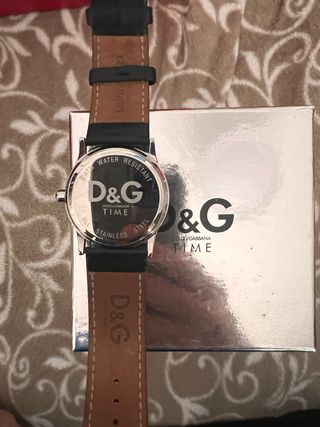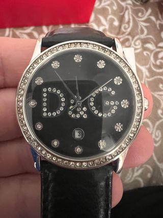 Elegante reloj de la marca Dolce & Gabbana con un diseño sofisticado. - Esfera negra con detalles brillantes. - Bisel adornado con cristales. - Correa de piel negra. - Indicador de fecha.