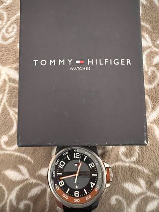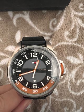 Reloj de la marca Tommy Hilfiger con detalles en naranja. - Esfera gris con marcadores horarios. - Correa de caucho negra.