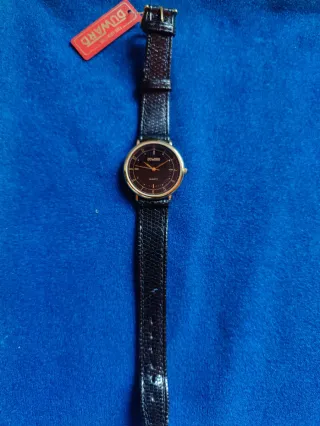 Elegante reloj de pulsera con un diseño clásico. - Correa de piel negra con textura. - Caja dorada. - Esfera oscura.