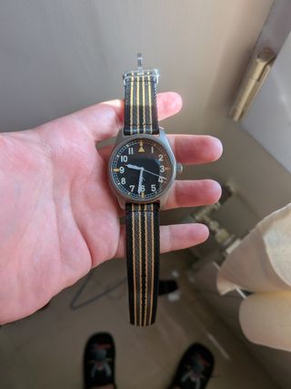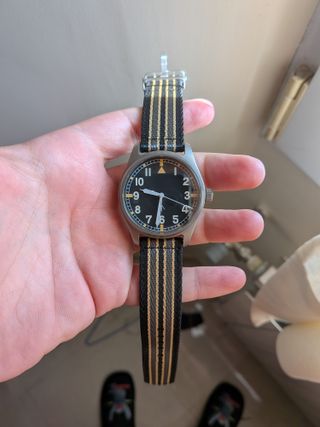 Reloj Tandorio automático con caja de titanio y correa de nylon resistente. Mecanismo nh35 de Seiko, cristal de zafiro irrayable y Wáter resistant de 200 metros. - Caja de titanio. - Correa de tela con rayas negras y doradas. - Esfera negra con números arábigos.