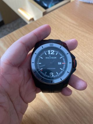 Reloj de pulsera de la marca Tommy Hilfiger con un diseño moderno y elegante. - Esfera negra con detalles plateados. - Correa negra. - Resistente al agua.