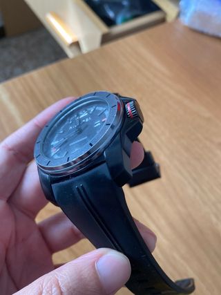 Reloj deportivo con un diseño moderno y llamativo. - Correa de goma negra. - Bisel con detalles en rojo. - Esfera con números y manecillas.