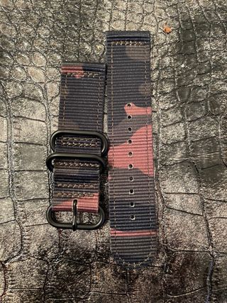 Preciosa correa de estilo Zulu con un diseño de camuflaje. - Ancho de 22mm. - Hebilla y pasadores de color negro mate. - Fabricada en nylon resistente.