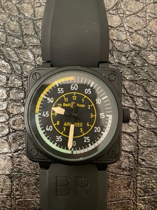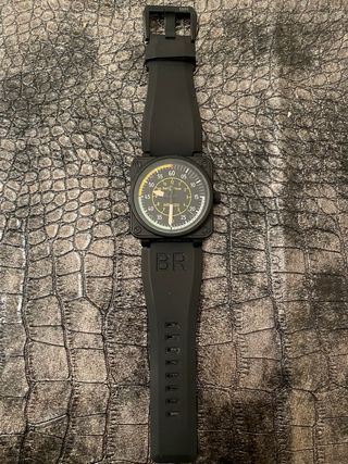 Elegante reloj de aviación con un diseño distintivo. B&R - Caja y correa en color negro. - Esfera con detalles en amarillo.