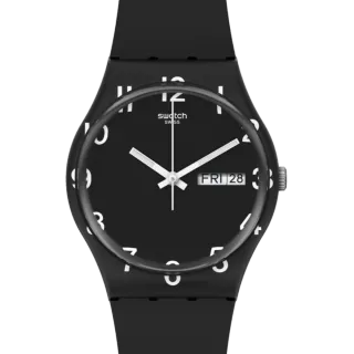 Reloj Swatch de diseño moderno y elegante. - Esfera negra con números blancos. - Correa negra de material resistente. - Ventana de día y fecha. En la esfera hay una pequeña rayita de uso.