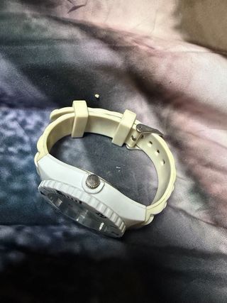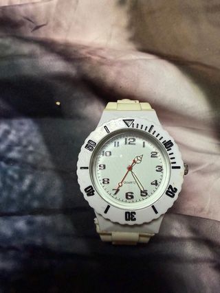 Reloj de pulsera con un diseño moderno y llamativo. - Esfera blanca con detalles en negro. - Correa de material resistente. - Bisel con marcadores.