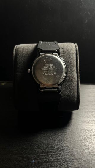 Reloj Casio modelo MQ-24 con diseño clásico y elegante. - Esfera blanca con números negros. - Correa negra. - Resistente al agua. - Tamaño entre 30 y 36mm aprox. -Para que funciona le falta ponerle la pila. Va bien para muñecas pequeñas