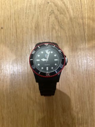 Reloj de pulsera con un diseño moderno y deportivo. - Usados dos veces. - Necesita cambio de pila. - Correa de silicona en color rojo. - Caja de reloj en color negro. - Resistente al agua hasta 50 metros.