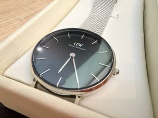 Elegante reloj Daniel Wellington con esfera negra y detalles plateados. - Diseño minimalista. - Correa de malla plateada. - Caja de acero inoxidable.