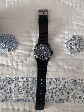 Reloj Seiko Samurai modificado, un modelo automático con resistencia al agua. - Caja Samurai de 44 mm. - Esfera con diseño texturizado. - Bisel giratorio 120 clicks unidireccional con detalles en azul. - Correa de caucho negra. - Movimiento original Nh35. - Cristal de zafiro. - Coroma roscada estanca. Completamente nuevo, nunca usado.