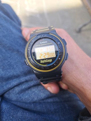 Reloj Casio con función de profundidad. - Resistente al agua 200M. - Bisel con marcadores. - Correa negra.