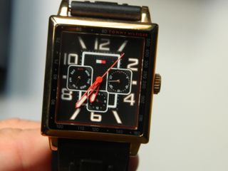 Elegante reloj Tommy Hilfiger con diseño de esfera cuadrada. Es nuevo sin uso. - Caja y detalles en tono dorado. - Correa negra. - Esfera principal en color negro.
