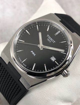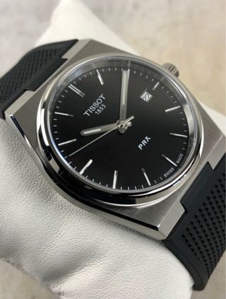 Reloj Tissot PRX con esfera negra y detalles plateados. - Diseño moderno y elegante. - Correa de caucho negra. - Indicador de fecha.