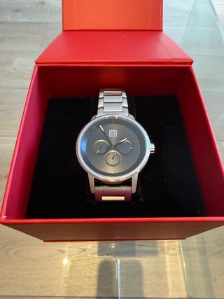 Reloj de pulsera con un diseño elegante y moderno. - Esfera negra con detalles dorados. - Correa de metal. - Resistente al agua. Tiene un pieza despegada pero se puede pegar sin problema (última foto)