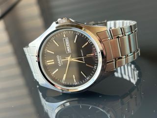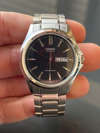 Reloj Casio MTP-1239 con esfera negra y detalles plateados. - Correa de metal plateado. - Indicador de día y fecha. - Resistente al agua.