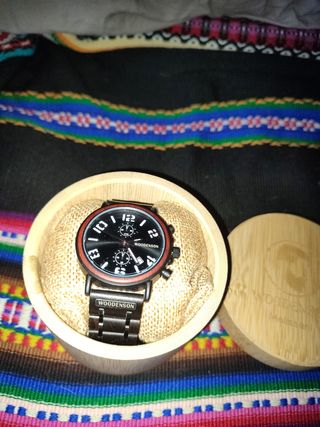 Sin estrenar y ni puesto en marcha.Reloj hecho artesanalmente y respetando el medio ambiente. Madera de ebano, sándalo, acero negro y Hardlex. Presuntamente resistente al agua. La correa lleva un sistema fácil y sencillo para sacar o poner eslabones.