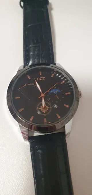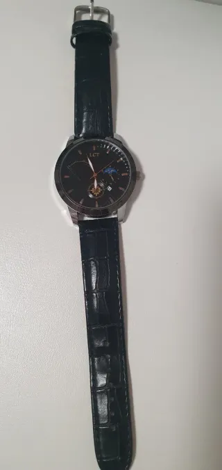 Elegante reloj LCT con correa de piel. - Esfera negra con detalles dorados. - Correa de piel negra. - Diseño con múltiples subesferas. Llevado en dos ocasiones Escucho ofertas