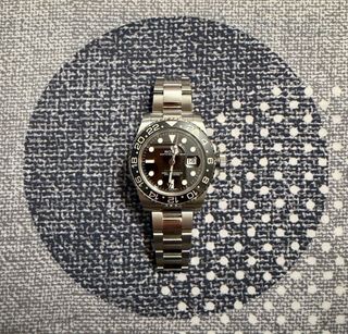 Reloj de pulsera Rolex GMT-Master II con esfera negra y detalles plateados. - Bisel giratorio bidireccional. - Ventana de fecha. - Correa de acero inoxidable. - Tengo Todo, Caja, Documentación, etc... - En Un Estado Casi Nuevo y Sin Rayas, Con Muy Poco Poco Uso y Revisado al Dia.