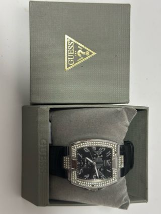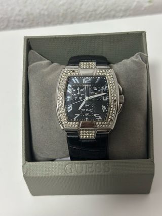 Elegante reloj Guess con un diseño llamativo y detalles brillantes. - Bisel adornado con cristales. - Correa de piel negra. - Esfera negra con detalles plateados.