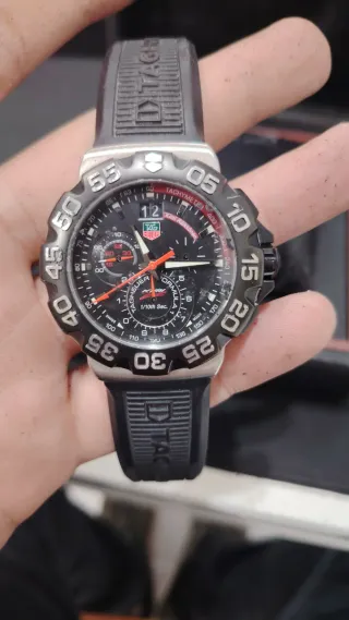 Reloj TAG Heuer Formula 1 con cronógrafo. Un accesorio deportivo y elegante. - caja papeles full equip - Bisel giratorio con números. - Correa de caucho negra. - Esfera negra con detalles en rojo y blanco. - Indicador de fecha.